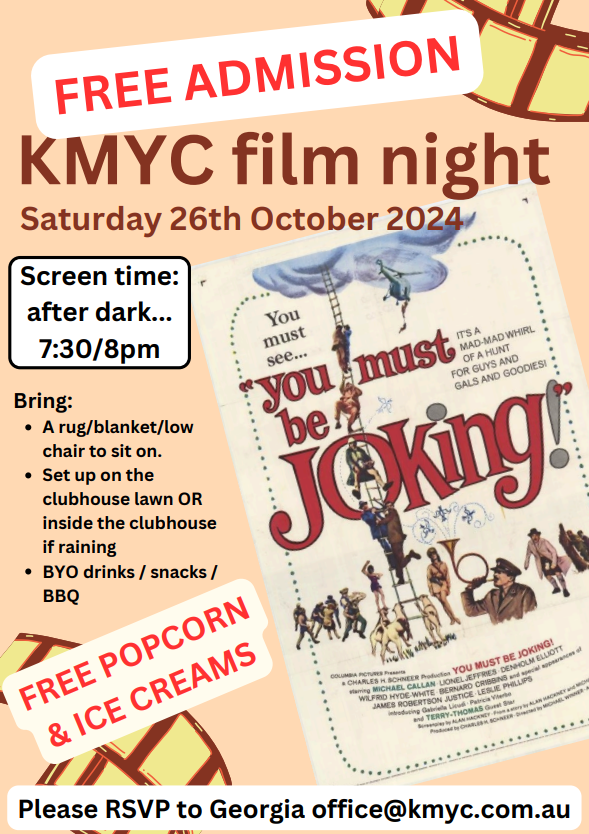 The ever popular KMYC Family Movie night Saturday 26th October…come & see You Must Be Joking and have fun on the lawns with family & friends… Uncategorized / By brucequick