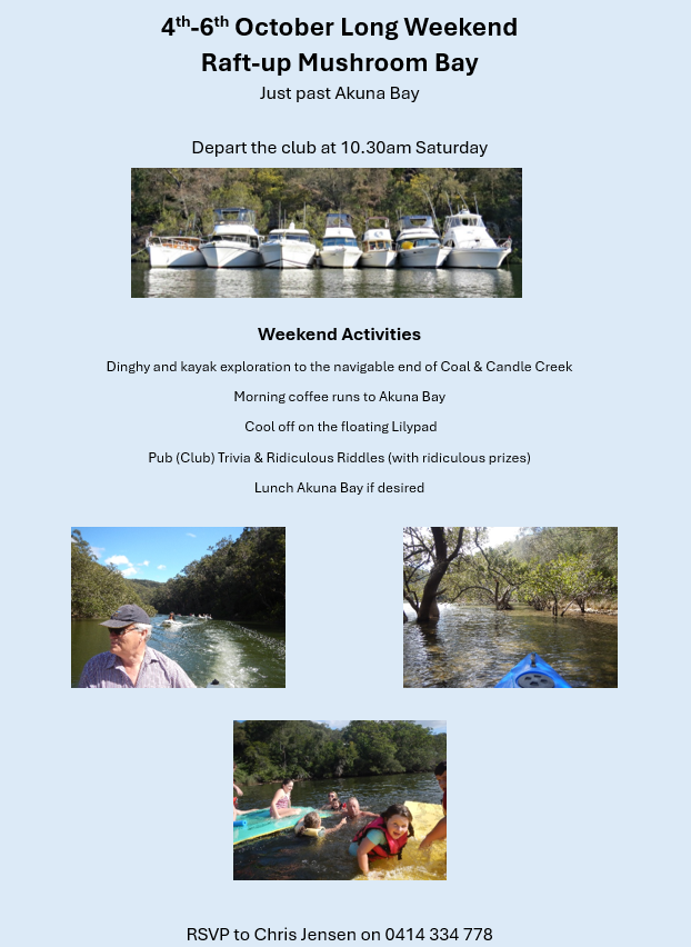 Long Weekend Raft-up at Mushroom Bay 4th to 6th October….let Chris Jensen know if you will be joining Uncategorized / By brucequick