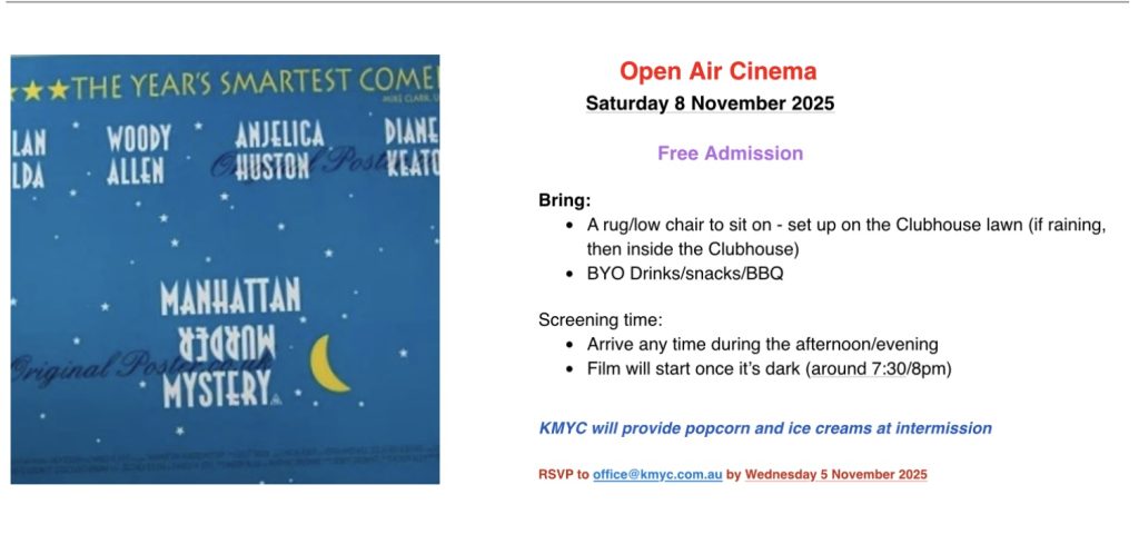 KMYC Open Air Cinema Saturday 8th November……Manhattan Murder Mystery – a classic who dunnit Uncategorized / By brucequick